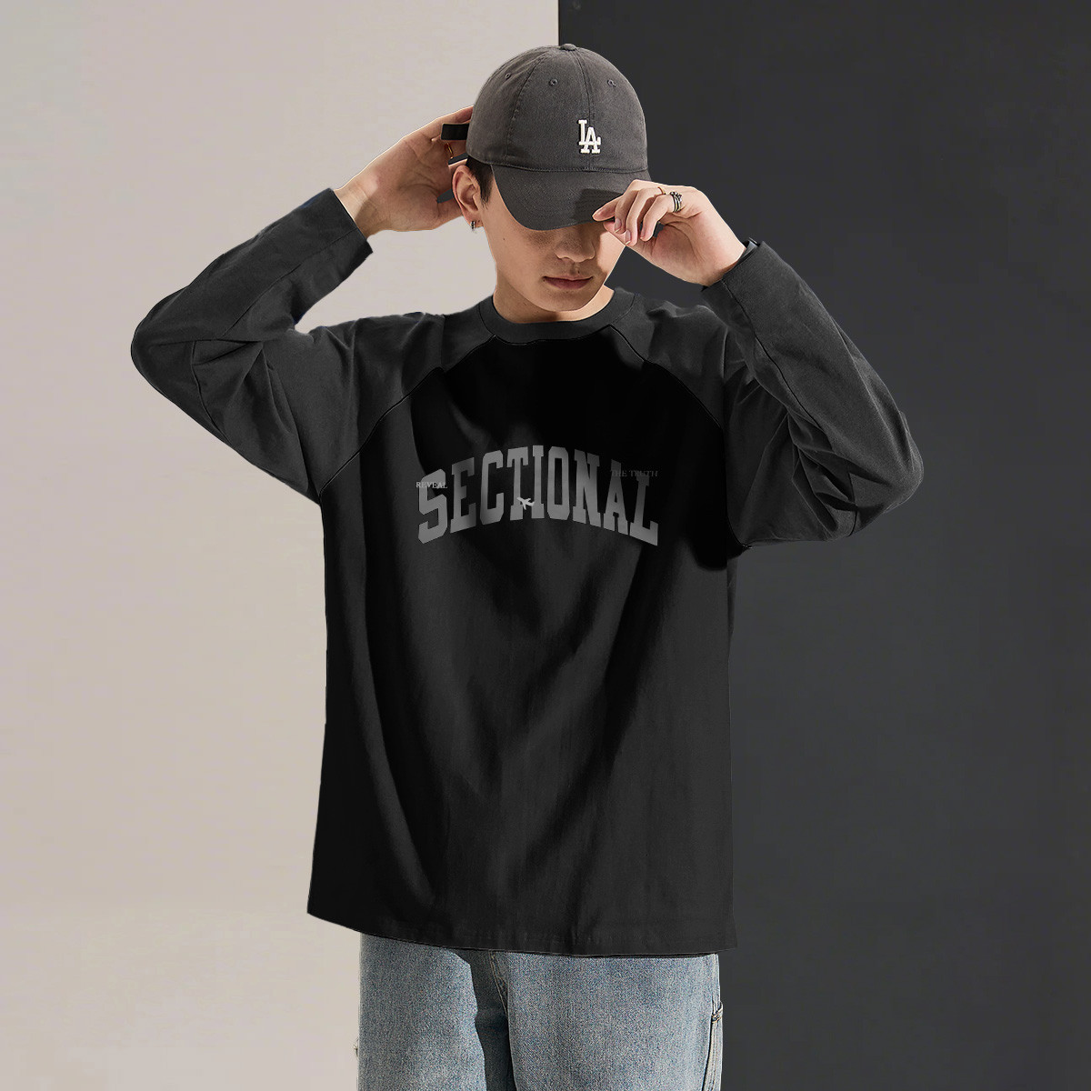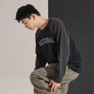 Autumn Men’s Long-sleeved T-shirt Top Men’s Crewneck Front Chest Text Printed Raglan Sleeves