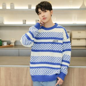 Sweater men’s round neck striped jacquard paragraph sweater casual Korean sweater winter men’s men’s sweater